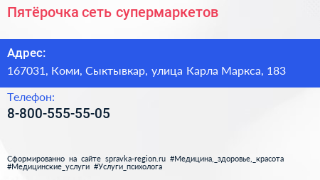 Пятёрочка, сеть супермаркетов по адресу 167031, Коми, Сыктывкар, улица Карла Маркса, 183 в дальнейшем Организация, размещена в следующих категориях: