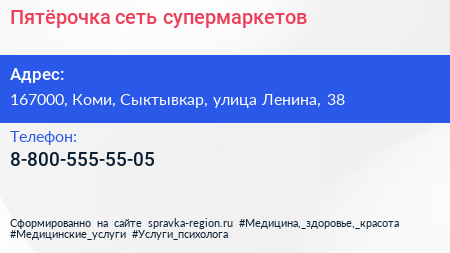 Пятёрочка, сеть супермаркетов по адресу 167000, Коми, Сыктывкар, улица Ленина, 38 в дальнейшем Организация, размещена в следующих категориях: