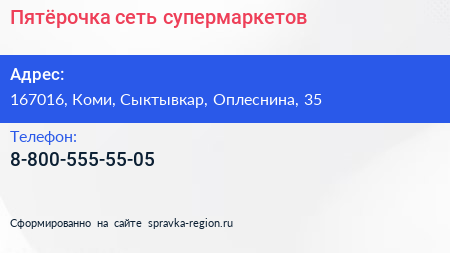Пятёрочка, сеть супермаркетов по адресу 167016, Коми, Сыктывкар, Оплеснина, 35 в дальнейшем Организация, размещена в следующих категориях: