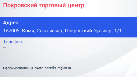 Покровский, торговый центр по адресу 167005, Коми, Сыктывкар, Покровский бульвар, 1/1 в дальнейшем Организация, размещена в следующих категориях: