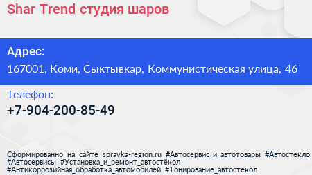 Shar Trend, студия шаров по адресу 167001, Коми, Сыктывкар, Коммунистическая улица, 46 в дальнейшем Организация, размещена в следующих категориях: