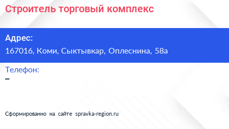 Строитель, торговый комплекс по адресу 167016, Коми, Сыктывкар, Оплеснина, 58а в дальнейшем Организация, размещена в следующих категориях: