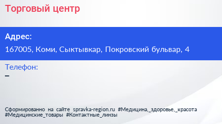 Торговый центр по адресу 167005, Коми, Сыктывкар, Покровский бульвар, 4 в дальнейшем Организация, размещена в следующих категориях: