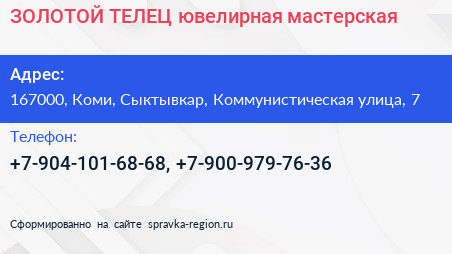 ЗОЛОТОЙ ТЕЛЕЦ, ювелирная мастерская по адресу 167000, Коми, Сыктывкар, Коммунистическая улица, 7 в дальнейшем Организация, размещена в следующих категориях: