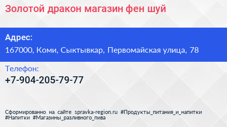 Золотой дракон, магазин фен-шуй по адресу 167000, Коми, Сыктывкар, Первомайская улица, 78 в дальнейшем Организация, размещена в следующих категориях: