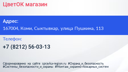 ЦветОК, магазин по адресу 167004, Коми, Сыктывкар, улица Пушкина, 113 в дальнейшем Организация, размещена в следующих категориях: