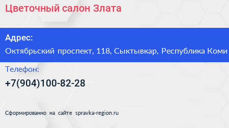 Цветочный салон «Злата» по адресу Октябрьский проспект, 118, Сыктывкар, Республика Коми в дальнейшем Организация, размещена в следующих категориях: