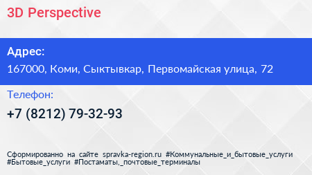 3D Perspective по адресу 167000, Коми, Сыктывкар, Первомайская улица, 72 в дальнейшем Организация, размещена в следующих категориях: