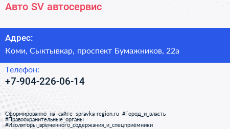 Авто SV, автосервис по адресу Коми, Сыктывкар, проспект Бумажников, 22а в дальнейшем Организация, размещена в следующих категориях: