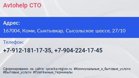 Avtohelp, СТО по адресу 167004, Коми, Сыктывкар, Сысольское шоссе, 27/10 в дальнейшем Организация, размещена в следующих категориях: