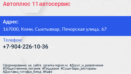 Автоплюс 11, автосервис по адресу 167000, Коми, Сыктывкар, Печорская улица, 67 в дальнейшем Организация, размещена в следующих категориях: