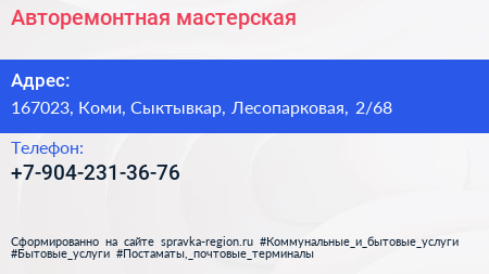 Авторемонтная мастерская по адресу 167023, Коми, Сыктывкар, Лесопарковая, 2/68 в дальнейшем Организация, размещена в следующих категориях: