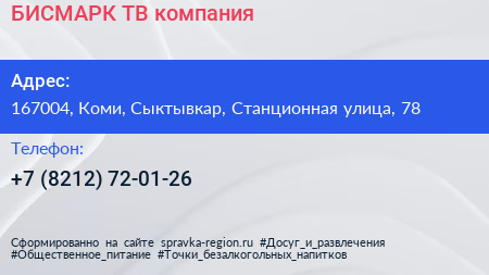 БИСМАРК.ТВ, компания по адресу 167004, Коми, Сыктывкар, Станционная улица, 78 в дальнейшем Организация, размещена в следующих категориях: