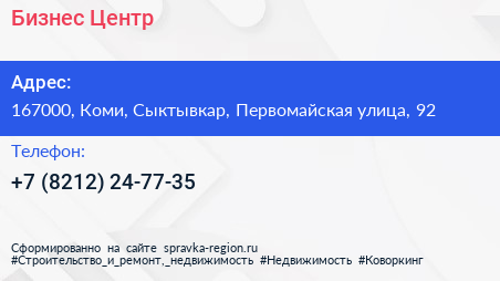 Бизнес-Центр по адресу 167000, Коми, Сыктывкар, Первомайская улица, 92 в дальнейшем Организация, размещена в следующих категориях: