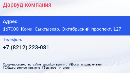 Дарвуд, компания по адресу 167000, Коми, Сыктывкар, Октябрьский проспект, 127 в дальнейшем Организация, размещена в следующих категориях:
