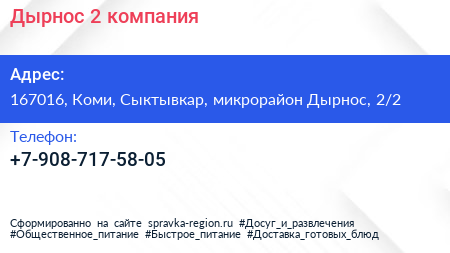 Дырнос-2, компания по адресу 167016, Коми, Сыктывкар, микрорайон Дырнос, 2/2 в дальнейшем Организация, размещена в следующих категориях: