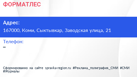 ФОРМАТЛЕС по адресу 167000, Коми, Сыктывкар, Заводская улица, 21 в дальнейшем Организация, размещена в следующих категориях: