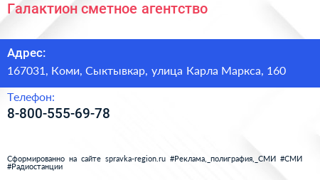 Галактион, сметное агентство по адресу 167031, Коми, Сыктывкар, улица Карла Маркса, 160 в дальнейшем Организация, размещена в следующих категориях:
