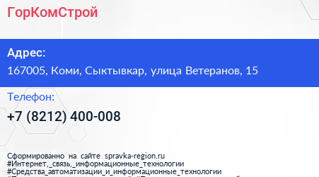 ГорКомСтрой по адресу 167005, Коми, Сыктывкар, улица Ветеранов, 15 в дальнейшем Организация, размещена в следующих категориях: