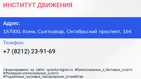 ИНСТИТУТ ДВИЖЕНИЯ по адресу 167000, Коми, Сыктывкар, Октябрьский проспект, 164 в дальнейшем Организация, размещена в следующих категориях: