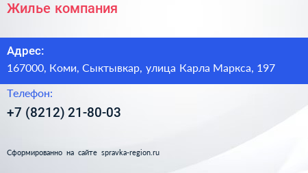 Жилье, компания по адресу 167000, Коми, Сыктывкар, улица Карла Маркса, 197 в дальнейшем Организация, размещена в следующих категориях:
