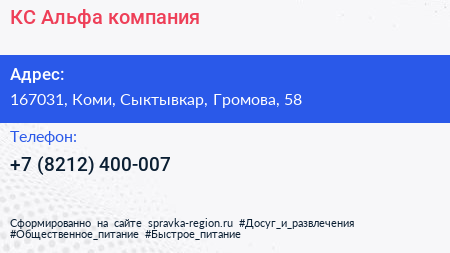 КС Альфа, компания по адресу 167031, Коми, Сыктывкар, Громова, 58 в дальнейшем Организация, размещена в следующих категориях:
