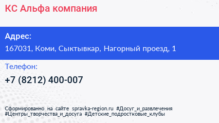 КС Альфа, компания по адресу 167031, Коми, Сыктывкар, Нагорный проезд, 1 в дальнейшем Организация, размещена в следующих категориях: