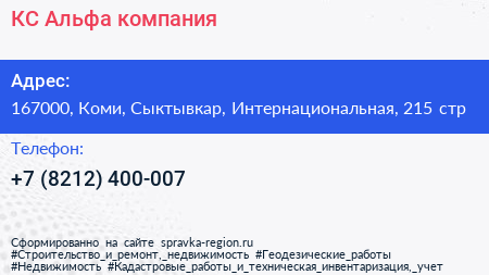 КС Альфа, компания по адресу 167000, Коми, Сыктывкар, Интернациональная, 215 стр в дальнейшем Организация, размещена в следующих категориях: