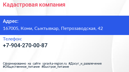 Кадастровая компания по адресу 167005, Коми, Сыктывкар, Петрозаводская, 42 в дальнейшем Организация, размещена в следующих категориях: