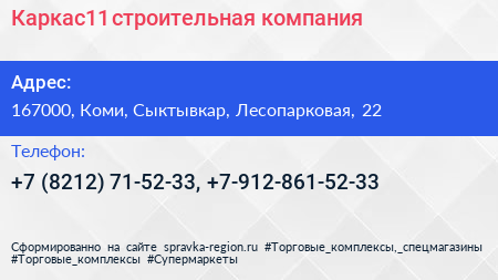 Каркас11, строительная компания по адресу 167000, Коми, Сыктывкар, Лесопарковая, 22 в дальнейшем Организация, размещена в следующих категориях: