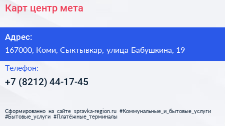 Карт-центр мета по адресу 167000, Коми, Сыктывкар, улица Бабушкина, 19 в дальнейшем Организация, размещена в следующих категориях: