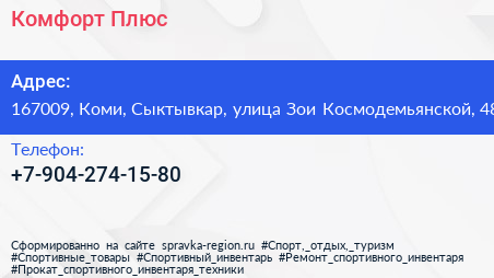 Комфорт Плюс по адресу 167009, Коми, Сыктывкар, улица Зои Космодемьянской, 48 в дальнейшем Организация, размещена в следующих категориях: