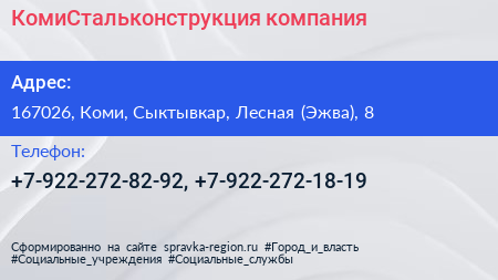 КомиСтальконструкция, компания по адресу 167026, Коми, Сыктывкар, Лесная (Эжва), 8 в дальнейшем Организация, размещена в следующих категориях: