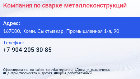 Компания по сварке металлоконструкций по адресу 167000, Коми, Сыктывкар, Промышленная 1-я, 90 в дальнейшем Организация, размещена в следующих категориях: