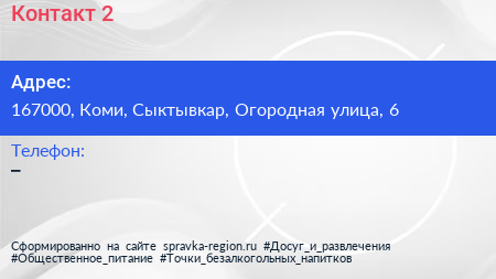 Контакт-2 по адресу 167000, Коми, Сыктывкар, Огородная улица, 6 в дальнейшем Организация, размещена в следующих категориях: