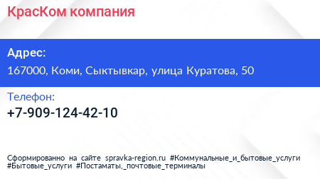 КрасКом, компания по адресу 167000, Коми, Сыктывкар, улица Куратова, 50 в дальнейшем Организация, размещена в следующих категориях: