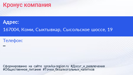 Кронус, компания по адресу 167004, Коми, Сыктывкар, Сысольское шоссе, 19 в дальнейшем Организация, размещена в следующих категориях: