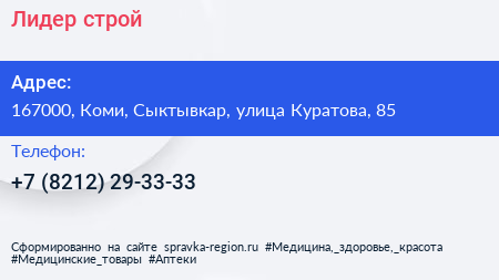 Лидер-строй по адресу 167000, Коми, Сыктывкар, улица Куратова, 85 в дальнейшем Организация, размещена в следующих категориях: