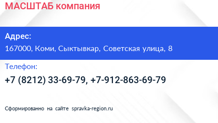 МАСШТАБ, компания по адресу 167000, Коми, Сыктывкар, Советская улица, 8 в дальнейшем Организация, размещена в следующих категориях: