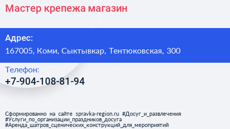 Мастер крепежа, магазин по адресу 167005, Коми, Сыктывкар, Тентюковская, 300 в дальнейшем Организация, размещена в следующих категориях: