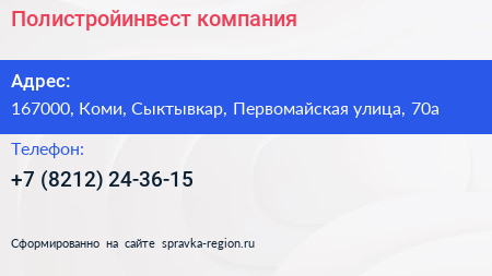 Полистройинвест, компания по адресу 167000, Коми, Сыктывкар, Первомайская улица, 70а в дальнейшем Организация, размещена в следующих категориях: