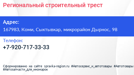 Региональный строительный трест по адресу 167983, Коми, Сыктывкар, микрорайон Дырнос, 98 в дальнейшем Организация, размещена в следующих категориях:
