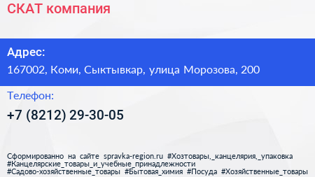 СКАТ, компания по адресу 167002, Коми, Сыктывкар, улица Морозова, 200 в дальнейшем Организация, размещена в следующих категориях: