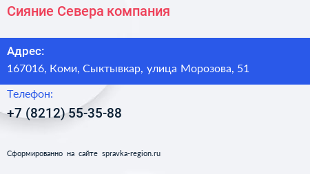 Сияние Севера, компания по адресу 167016, Коми, Сыктывкар, улица Морозова, 51 в дальнейшем Организация, размещена в следующих категориях: