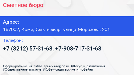 Сметное бюро по адресу 167002, Коми, Сыктывкар, улица Морозова, 201 в дальнейшем Организация, размещена в следующих категориях: