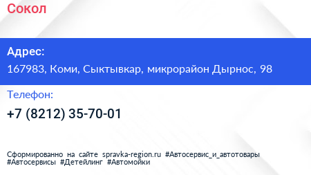 Сокол по адресу 167983, Коми, Сыктывкар, микрорайон Дырнос, 98 в дальнейшем Организация, размещена в следующих категориях: