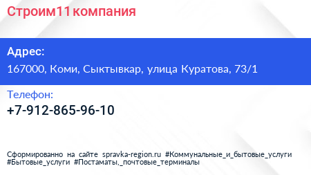 Строим11, компания по адресу 167000, Коми, Сыктывкар, улица Куратова, 73/1 в дальнейшем Организация, размещена в следующих категориях: