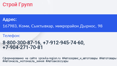Строй Групп по адресу 167983, Коми, Сыктывкар, микрорайон Дырнос, 98 в дальнейшем Организация, размещена в следующих категориях: