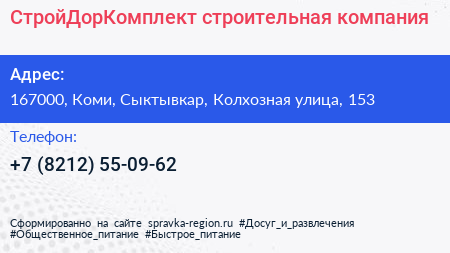 СтройДорКомплект, строительная компания по адресу 167000, Коми, Сыктывкар, Колхозная улица, 153 в дальнейшем Организация, размещена в следующих категориях: