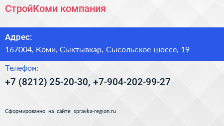 СтройКоми, компания по адресу 167004, Коми, Сыктывкар, Сысольское шоссе, 19 в дальнейшем Организация, размещена в следующих категориях: